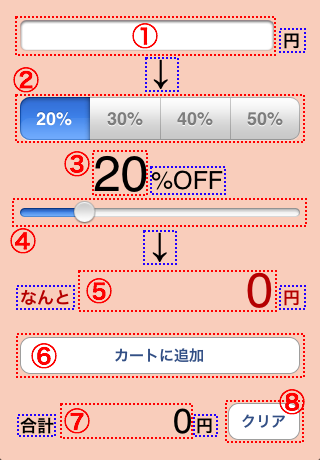 割引後の値段を計算 したら 10進数 で整形( stringWithFormat ) して 文字列に変換( NSString ) 、Text 形式のpriceNew にセットする。