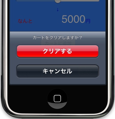 UIActionSheet *actionSheet = [[UIActionSheet alloc] initWithTitle:@"カートをクリアしますか?" delegate:self cancelButtonTitle:@"キャンセル" destructiveButtonTitle:@"クリアする" otherButtonTitles:nil];