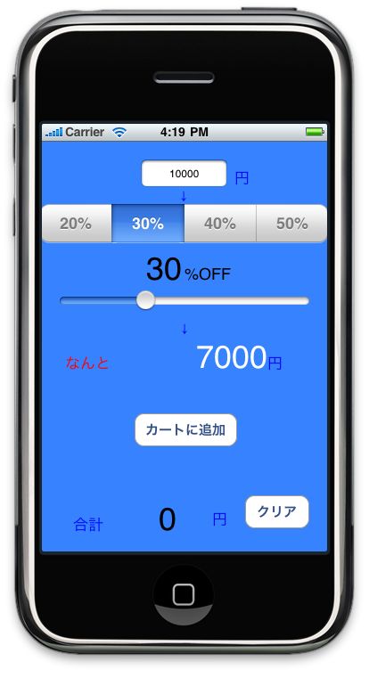 割引後の値段を計算 したら 10進数 で整形( stringWithFormat ) して 文字列に変換( NSString ) 、Text 形式のpriceNew にセットする。