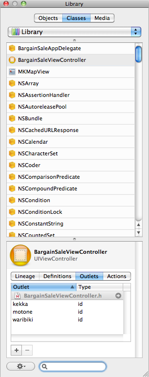 この関連付けが、Interface Builder にある Library -> Classes -> Outlets であり Actions 。